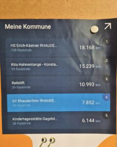 Zusätzlich wurde ein besonderer Aktionstag „CO₂-frei zur Schule“ im Rahmen des Stadtradelns durchgeführt. Hier konnte sich die Klasse 5.2 als fahrradaktivste Klasse durchsetzen: Über die Hälfte der Schülerinnen und Schüler dieser Klasse kam an diesem Tag mit dem Fahrrad zur Schule und leistete damit einen echten Beitrag zum Klimaschutz. Als kleine Belohnung erhielten die Teilnehmenden Präsente aus dem Erasmus+-Fundus.