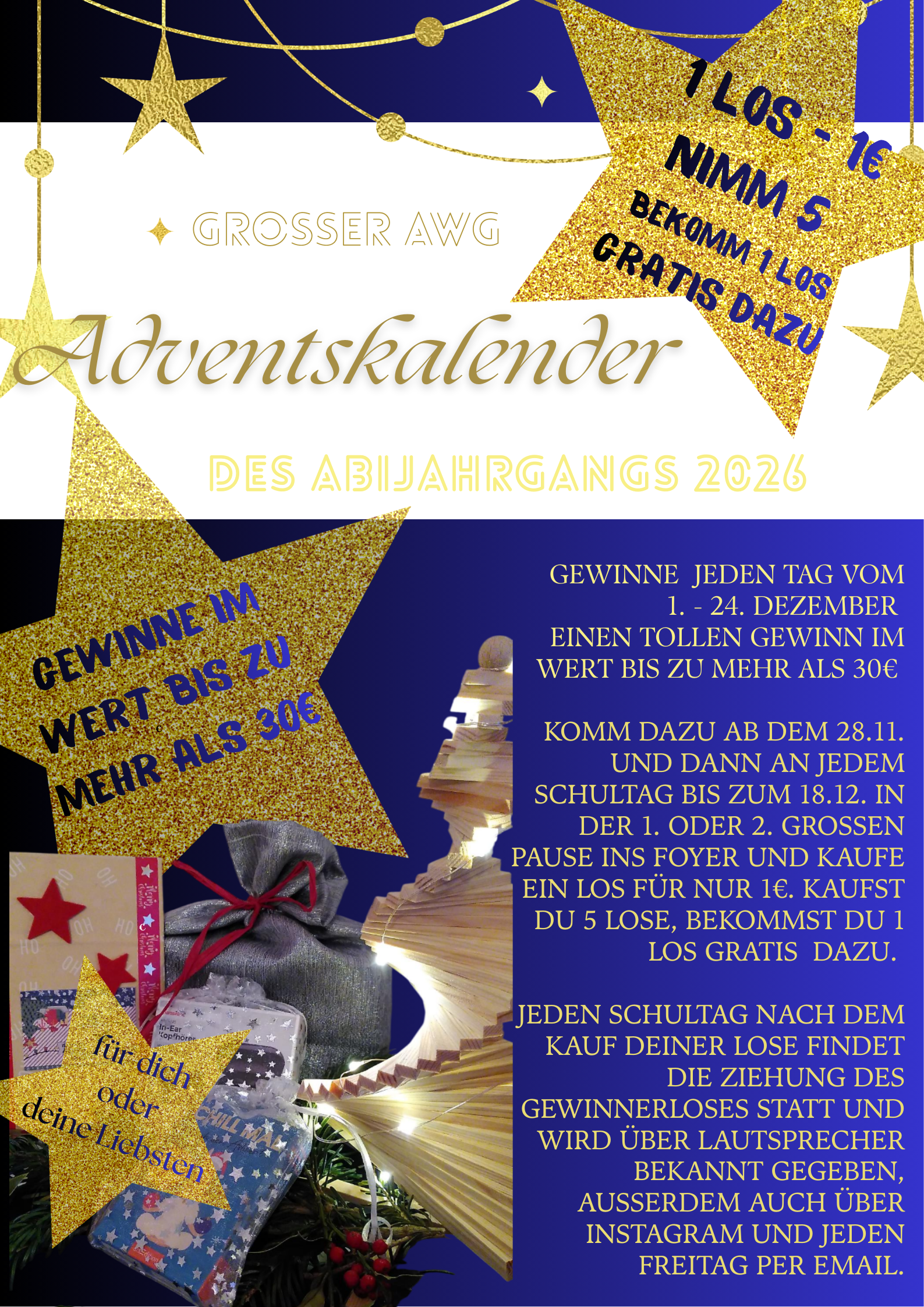 Die Gewinnlosnummern werden auf Instagram unter awg.abi26 veröffentlicht. Jeden Freitag wird zudem eine E-Mail mit allen Gewinnern der vergangenen Woche versendet. Wir wünschen allen Teilnehmenden viel Glück und eine schöne Adventszeit! 🕯