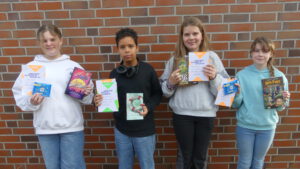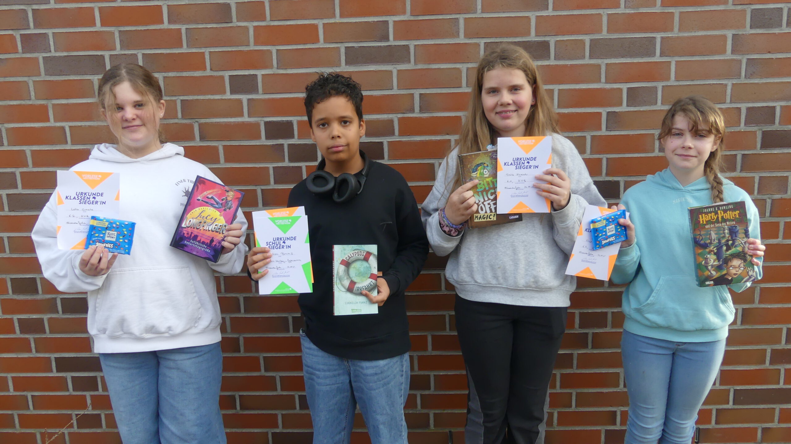 Am 24. November fand die Endrunde des Schulentscheids am Albrecht-Weinberg-Gymnasium statt. Die vier Klassensieger:innen der 6. Klassen traten dabei im Lesewettstreit gegeneinander an. Deike Ahrends (6.1), Lotta Groote (6.2), Julian Bruns (6.3) und Finja Haun (6.4) waren natürlich aufgeregt, lasen aber alle sehr souverän, anschaulich und lebhaft. In der ersten Runde galt es, eine vorbereitete Textstelle aus einem selbst gewählten Buch zu lesen, in der zweiten Runde lasen die Klassensieger:innen eine ihnen unbekannte Passage aus David Walliams Jugendroman „Gangsta-Oma“.