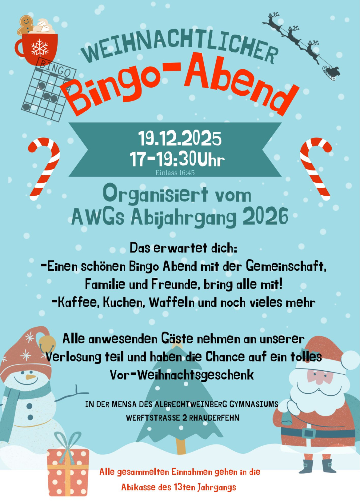 Der 13. Jahrgang des Albrecht-Weinberg-Gymnasium lädt herzlich zum Bingo-Abend im weihnachtlichen Stil ein: