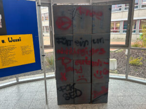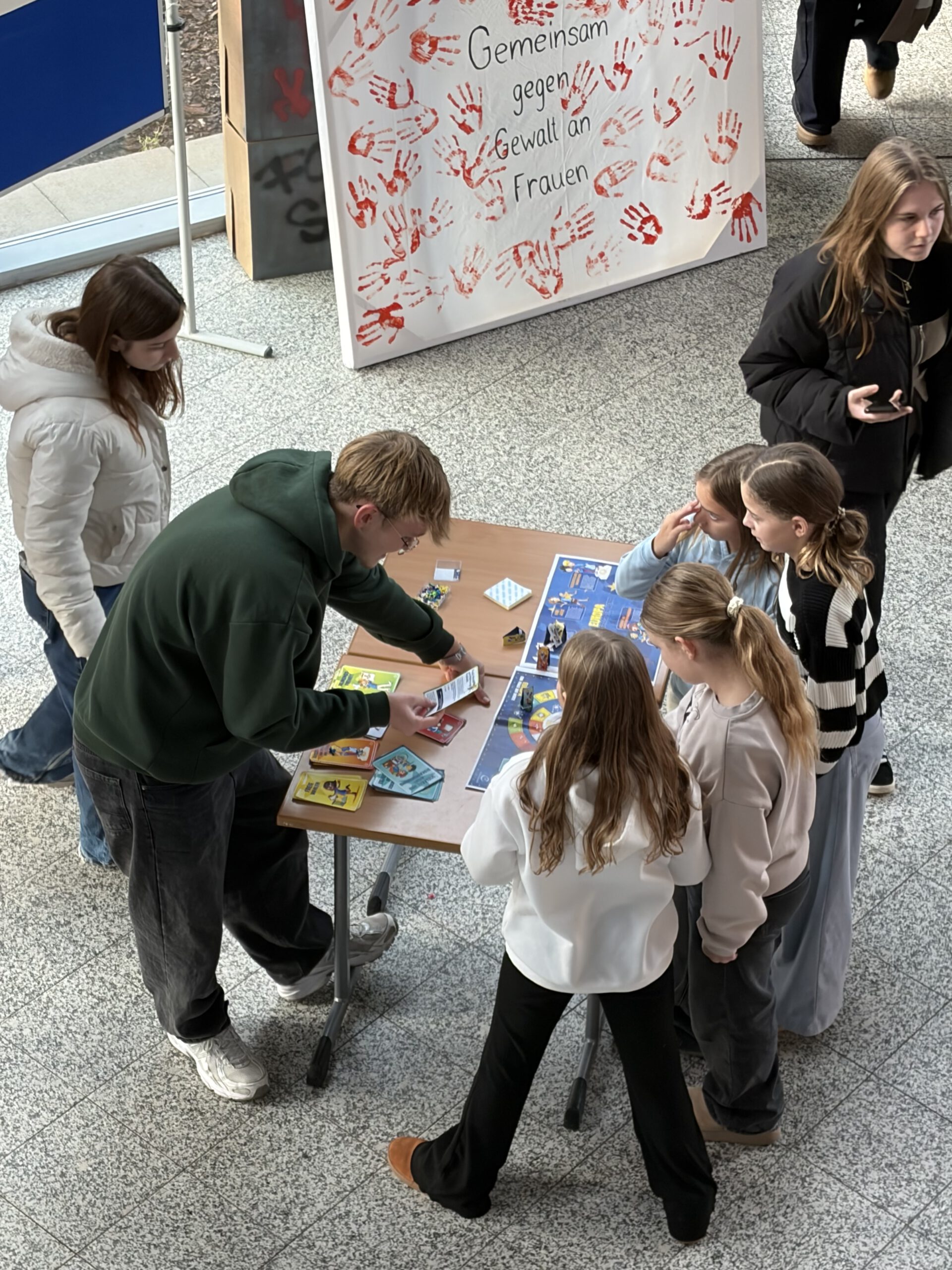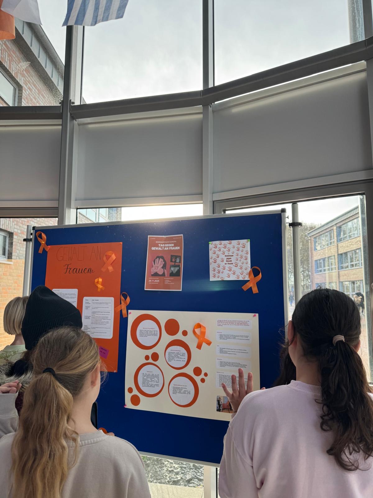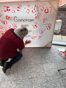 Neben Informationstafeln zu Formen von Gewalt, Hilfsangeboten und zentralen Fakten stand hier die aktive Beteiligung im Mittelpunkt: Mitglieder der Schulgemeinschaft waren eingeladen, mit einem orangefarbenen Handabdruck – der Symbolfarbe des Tages – ihre Solidarität zu bekunden. Diese Mitmachaktion wurde intensiv genutzt und verlieh der Ausstellung eine starke gemeinschaftliche Wirkung. Ein Quiz und ein Interview vertieften die Auseinandersetzung. -