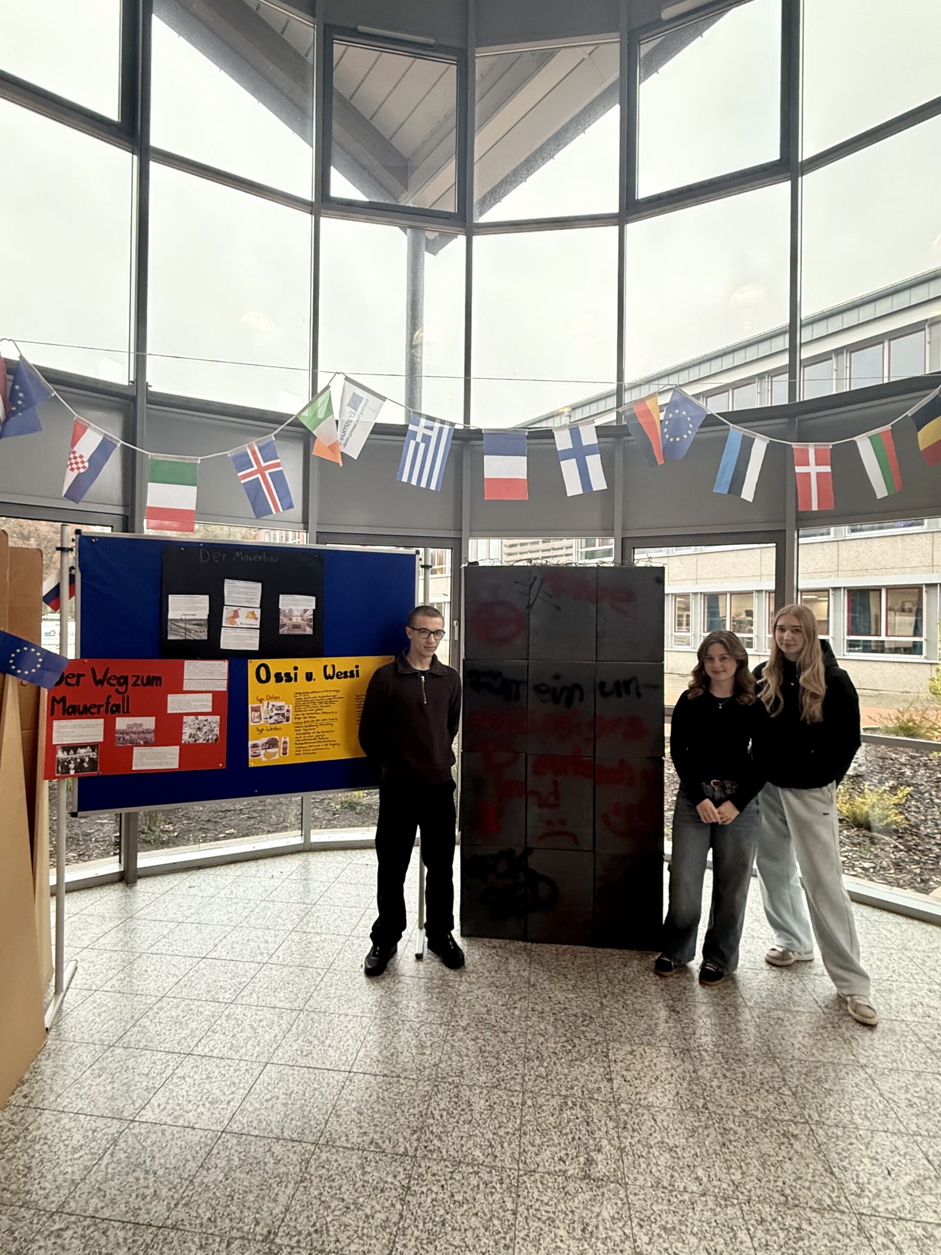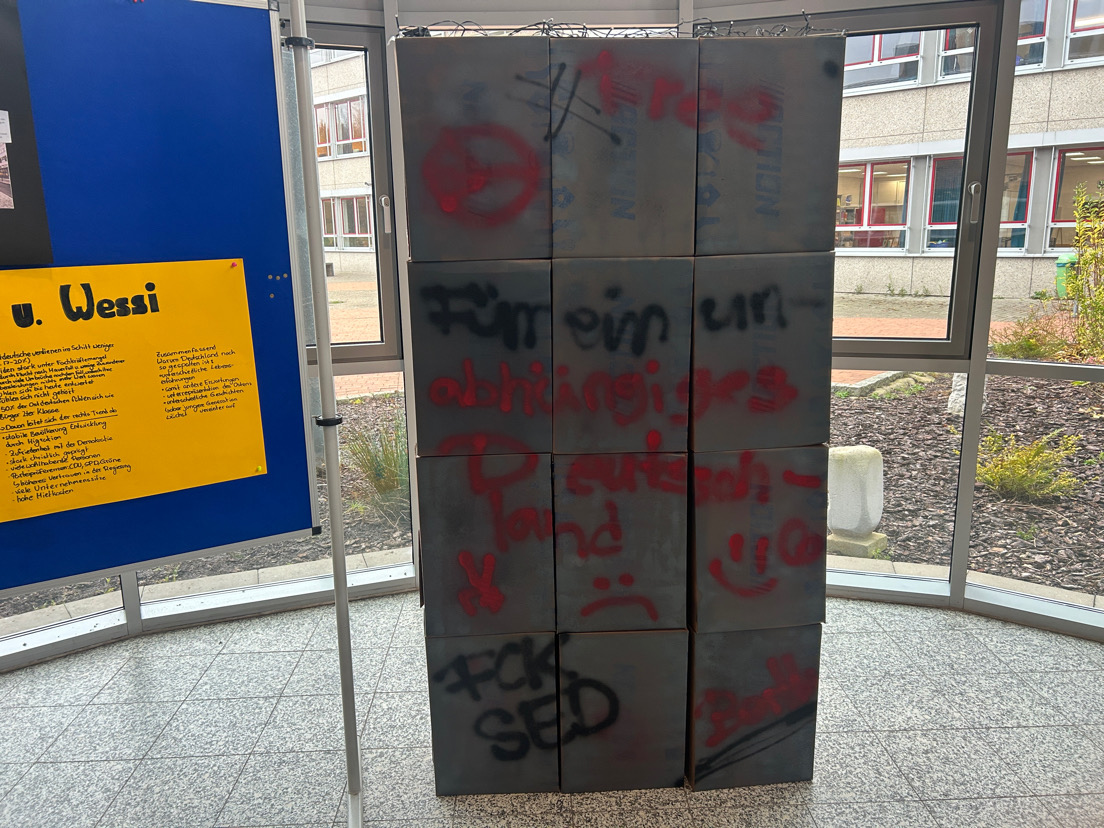 Eine selbstgebaute Mauer in der Europa-Ecke machte Teilung und Wiedervereinigung sinnlich erfahrbar. Die Ausstellung verband historische Erinnerung mit aktuellen Fragen nach Freiheit, Einheit und Verantwortung in Europa. -