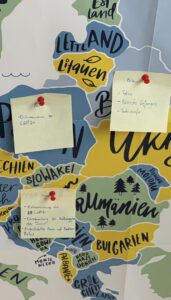 Eine große Europa-Karte, auf der mithilfe von Post-its sichtbar wurde, wo Menschenrechte weltweit gefährdet sind, sowie ein interaktives Spiel regten zur Reflexion über Verantwortung, Solidarität und globale Zusammenhänge an.