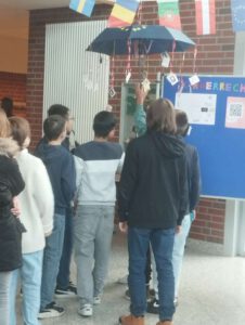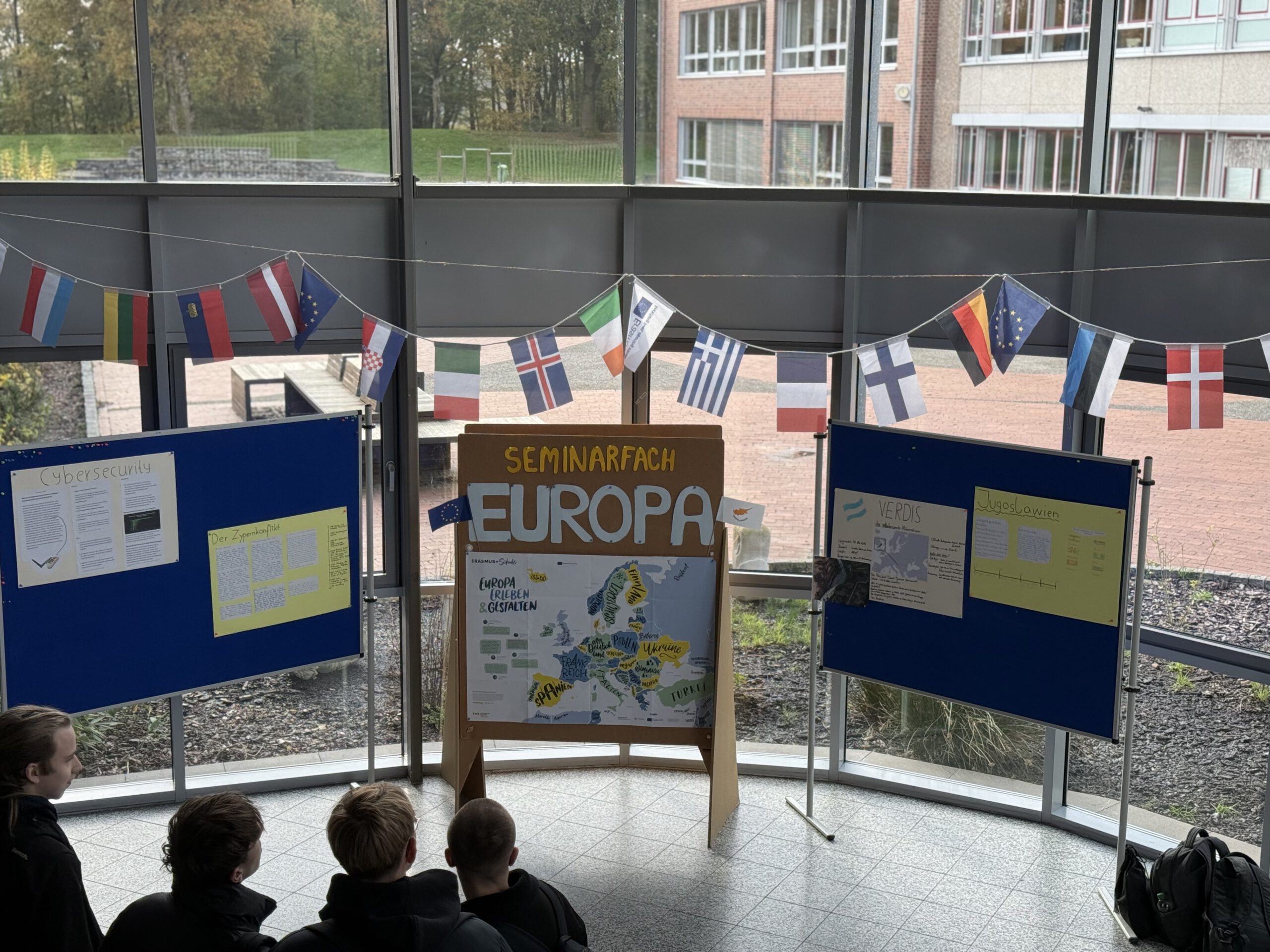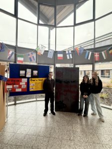 Im November und Dezember hat das Seminarfach Europa (Jahrgang 12) eine Mitmach-Ausstellungsreihe im Schulfoyer gestaltet. In der eigens eingerichteten „Europa-Ecke“ griffen die Schülerinnen und Schüler über mehrere Wochen hinweg europäische Thementage auf und luden die gesamte Schulgemeinschaft dazu ein, sich zu informieren, mitzudenken und Haltung zu zeigen. Die Ausstellung wurde immer montags in den großen Pausen erweitert und machte Europabildung im Schulalltag sichtbar und erfahrbar.