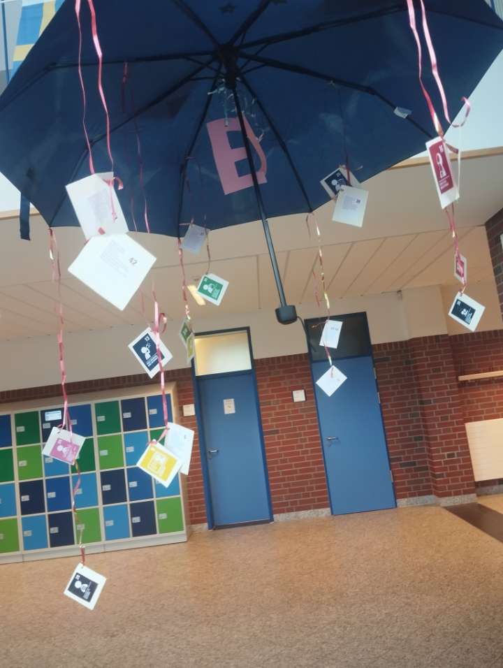 Zwei aufgespannte Regenschirme mit EU-Sternen, an deren Fäden einzelne Kinderrechte befestigt waren, setzten ein eindrucksvolles Symbol: Europa stellt Kinderrechte unter einen Schutzschirm – Kinder werden nicht „im Regen stehen gelassen“. Ergänzt wurde die Installation durch informative Plakate sowie ein Quiz im Emoji-Format. -
