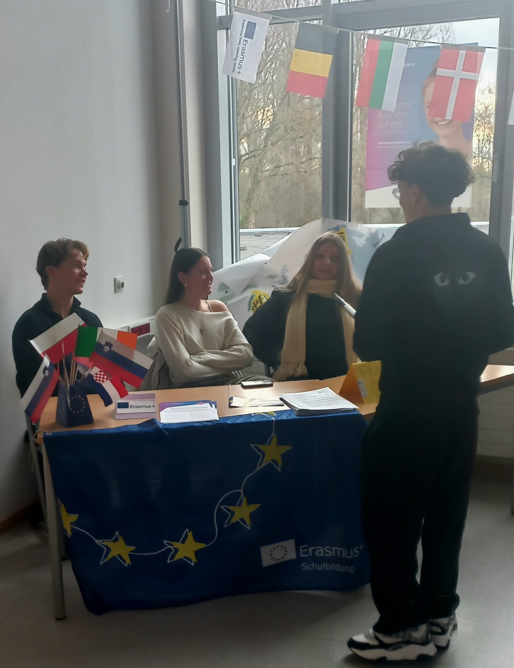 Im vergangenen Herbst haben die 11. Klassen ihr Betriebspraktikum absolviert. Zu den dort gewonnen Erfahrungen haben die Elftklässler*innen digitale Präsentationen, Flyer, Videos und Podcasts erstellt und im Zuge der diesjährigen Praktikumsmesse ausgestellt. Die Praktikumsmesse wurde von den Schüler*innen des 10. Jahrgangs besucht. Schließlich steht für die Zehntklässler*innen im kommenden Schuljahr das Betriebspraktikum an. Dementsprechend beginnt für die 10. Klassen nun die Suche nach einem geeigneten Praktikumsplatz. Dabei steht es den Schüler*innen auch offen, ihr Praktikum im EU-Ausland zu machen. Auslandspraktika, die von Erasmus+ unterstützt werden, gewinnen an unserer Schule immer größerer Beliebtheit. Im Herbst haben 13 Elftklässler*innen ihr Praktikum in Frankreich, Spanien, Portugal, in der Slowakei und auf Zypern und Malta absolviert. Auch diese Möglichkeit wurde bei der Praktikumsmesse vorgestellt.